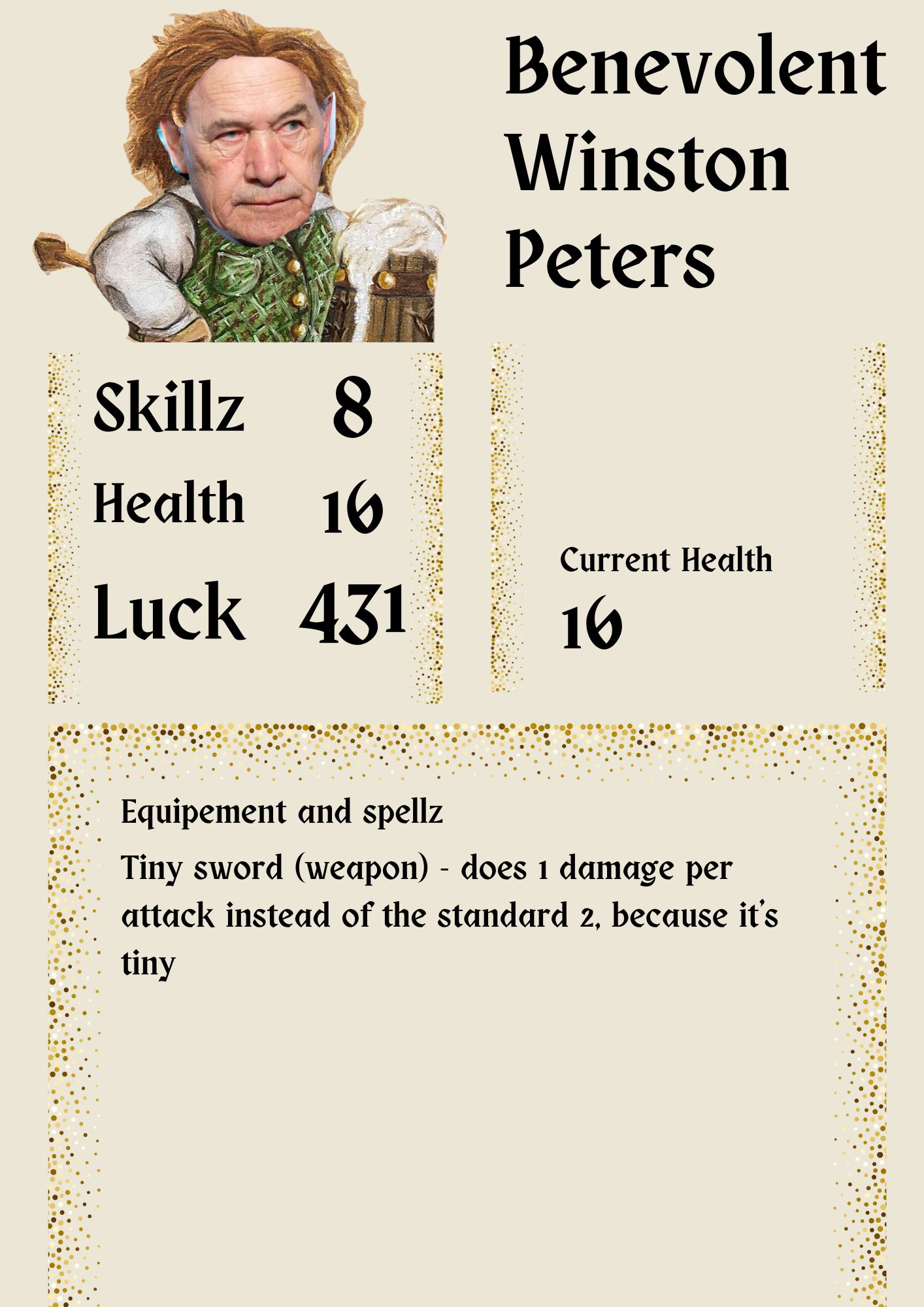 But what you probably didn’t know, unless you’re a big nerd and you’ve done this kind of thing before, is that you’ve also got a character sheet, that describes the character your chose. You can copy it out on a bit of paper, or print it if you have access to a printer, whatever that might be.